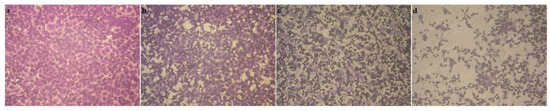 Morphological alterations of ovarian adenocarcinoma cell line (SKOV-3) treated with synthesized TiO2 nanoparticles concentrations for 24 h (a): Control; (b): 20 μg/mL; (c): 100 μg/mL; (d): 500 μg/mL 100×.