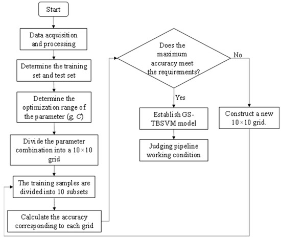 The parameters of RBF include kernel parameter g and penalty parameter C, and the grid search algorithm will first take these two parameters as a combination to form a parameter space. Then, the space is divided into equal grids according to the proposed coordinate system, and each group of vectors in the coordinate system represents a group of (C, g) values. By bringing each group of data in the space into the TBSVM, the performance of the model is verified until the optimal values of kernel parameter g and penalty parameter C are found. The specific process is shown in Figure 2.