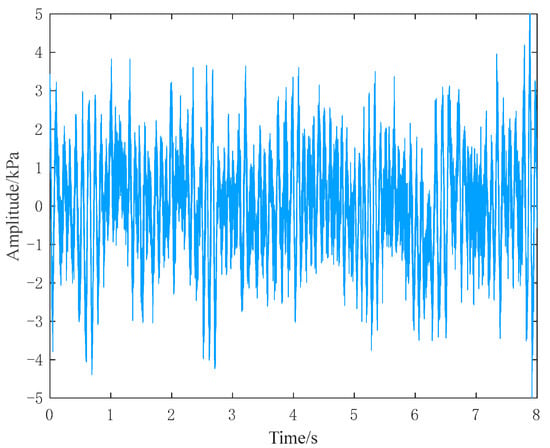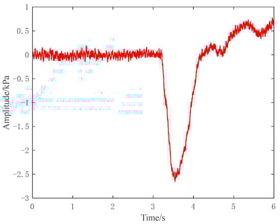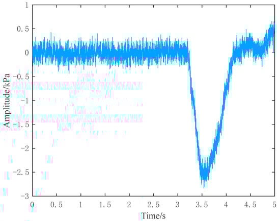 The acoustic signal collected by sensor 1 was used as an example for the denoising experiment. The 8-mm valve at 3 km of the pipeline was opened to simulate a leak in the pipeline, and the original signal collected by sensor 1 at the first station of the pipeline is shown in Figure 6.