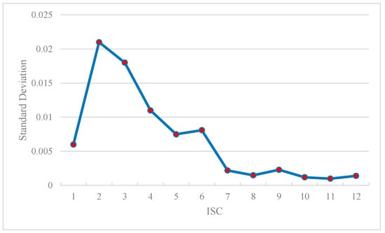 The Fourier transform of each ISC component obtained from the UPLCD decomposition yields spectrograms that vary widely and with different degrees of dispersion. The spectrograms of the noise-dominated ISC components are more complex. The standard deviation reflects the degree of dispersion of a data set, and it can visually reflect the degree of deviation of a data set compared to the variance. Therefore, the standard deviation can be used to determine which components are signal-dominated. To prevent the ISC components of different orders after the Fourier transform from differing in order of magnitude, this paper first normalizes the values and then calculates the standard deviations between different ISC components. Figure 8 shows the standard deviation of the magnitude of each ISC component after Fourier transform.