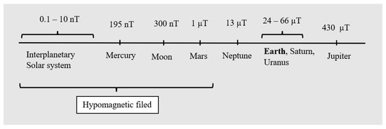 Hypomagnetic fields (HMFs) commonly occur in the interplanetary space of the solar system and fluctuate in the range of several nanoteslas (nT). For example, the lunar magnetic field is less than 300 nT, and the magnetic field on Mars is approximately 1 µT [3]. The planetary magnetic field of Mars is extremely small, and the planetary magnetic field of Venus is practically non-existing [4] (Figure 1).
