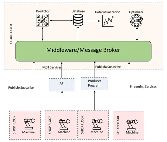 After the data are extracted, they are sent to the middleware that is responsible for handling all the communications from the shopfloor machines and between the cloud applications. The middleware based on a publish/subscribe approach allows the introduction of several new and different machines without the need for complicated integration of all the other machines. The new machines need only to connect with the middleware and, after the connection is successful, subscribe and publish to the relevant topics. The same can be said for cloud applications, as the new software only needs to be able to communicate with the middleware, using one of the mechanisms at its disposal, and utilize the available data to execute the application process and then publish the results. The machines can also receive and publish different types of data, granting other machines or software the possibility to use this data as they deem fit and change parameters or tasks as the data changes. The approach of publish/subscribe allow one of the main advantages of the usage of the architecture, being the scalability of the shopfloor, machinery or local and cloud-software only by needing the new systems to connect to the middleware.