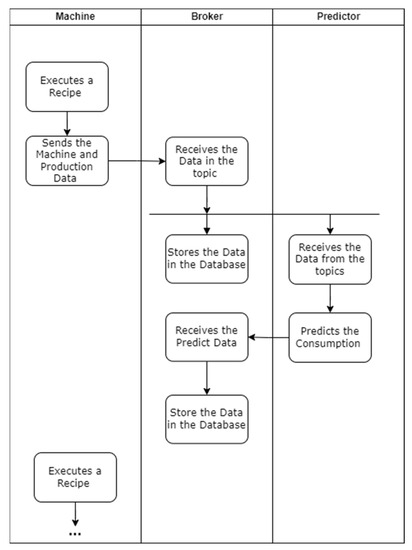 Regarding the communication between the different devices of the architecture, an activity diagram was created, see Figure 2. The diagram, which will support the implementation, demonstrates how the different systems communicate with each other. It can be seen in the diagram that the communication between the shopfloor machinery starts after the end of production, and all the relevant metrics are sent to the message broker. The message broker not only stores the data in the database but also allows other programs to subscribe to the topic and receive the subscribed metrics. Finally, the communication between the message broker and the predictor is highlighted. After receiving the data, the predictor utilizes the input machinery data to predict the energy consumption. Then, after concluding the prediction, the software sends the new data to another topic of the message broker with the objective of storing the data in the database.