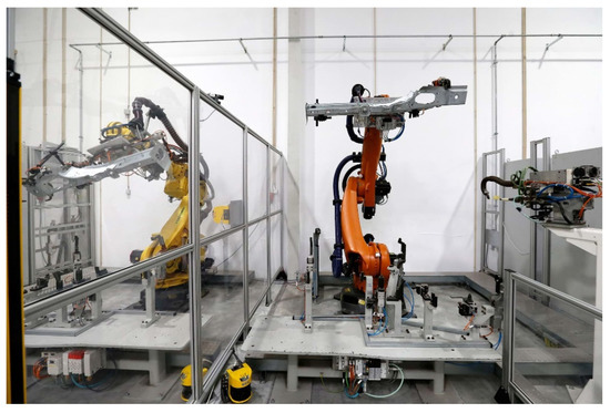The demonstration scenario for the beforementioned solution was based on the current robotic assembly cells used in Introsys SA installations, in Quinta do Anjo, Portugal, for testing and training (Figure 3). These cells were first introduced during Proflex project, with the main objective of closing the gap between academia and industrial manufacturers by providing pilots, which represent the reality of actual production lines regarding equipment, safety and control standards used and approved by the automotive industry, yet they do not take in to account the major drawbacks and risks of cells imbedded in production lines, where changes and new integrations cannot be made with ease due to the risk of causing disruptions to the production line itself and its respective value chain. Each one implements several spot-welding processes and comprises a 6-DoF robotic arm with a custom gripper attached, a fixture into which the operator inserts and removes the product before and after the process, a stationary welding gun and several sensors to monitor energy consumption for the different components mentioned.