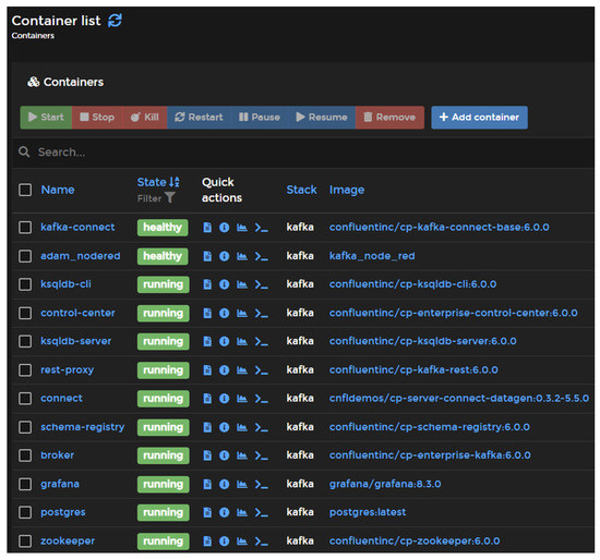 There are multiple ways to deploy software in the cloud, either by using several open software services, such as Cloud Foundry, or privately owned clouds, such as in the case of Google Cloud or Microsoft Azure. The most notable feature of most cloud-based software deployment platforms is their operation, as they typically use a container-based approach to deal with the deployed software. Thus, a privately owned server with a container-based approach can work very similarly to the core base of this software. As such, the portainer.io software was used to instantiate the system architecture. This software allows the user to easily deploy, configure and secure containers on Docker, Kubernetes, Swarm and Nomad in any cloud, datacenter or device. Figure 5 depicts the Introsys server with the portrainer.io software, where several Docker containers are deployed. Each container can be described as a single program or system that is self-contained and can only communicate with other containers or with the outside in specific channels. The Docker software also has a repository with several programs built and ready to use, with the added advantage of being separated by version. This allows the same version to be deployed and maintained, facilitating the transitions from the test environment to the industrial sector or maintaining a compatible version that may break in later versions. Finally, the user’s own container can also be deployed, with a set of software and connections deemed useful for the situation and allowing the Docker software to build the container with the information and installation specified by the user. This was the specific case for the customized ML prediction software, which was then deployed in an API.