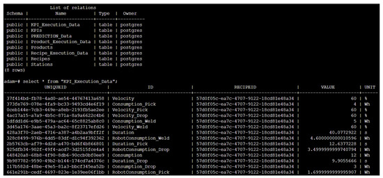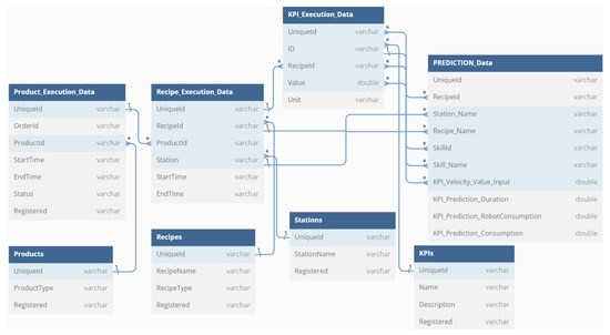 In Figure 7, the data model of the implementation is presented. In this demonstration, eight tables were made, accommodating all the necessary and available data from the execution of recipes and products to the catalog of the different recipes, products and stations available in the factory. The prediction table stores the ML model’s prediction, connecting the existing execution data with that of each recipe as well as their key performance indicators (KPI), allowing to correlate the prediction of the models with the real values. The correlation can be further used to analyze some flaws that the machine might have, as it represents an excess of consumption in the models. It is also worth noting the relationship between each table, as it helps present a clear picture of the behind-the-scenes work of the data flow, not only in a real industrial environment but also in the specific case of this demonstration and ML model usage.