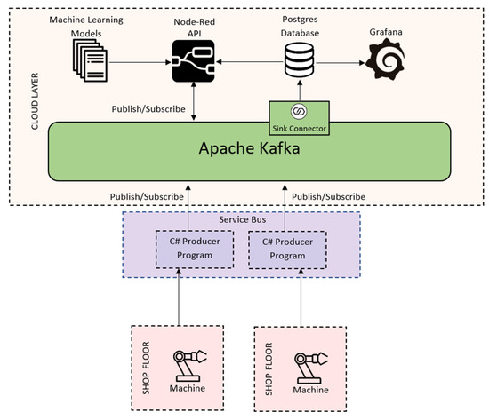 The middleware used in the implementation of the architecture was Apache Kafka. Apache Kafka is a message broker/streaming service that allows topics to be published and subscribed to by dedicated libraries and an API. Apache Kafka also excels in scalability, allowing it to serve as the architecture’s middleware with ease, connecting all shopfloor machinery and cloud applications. Moreover, Kafka enables the use of streaming services, connecting cloud applications, such as databases, through a stream without the need for an intermediate program and giving a constant flow of information as soon as it arrives at the topic. A more focused view of the message broker can be found in an article written by the team that addresses the middleware functionalities in greater detail, focusing on the message broker and why Apache Kafka was chosen [27]