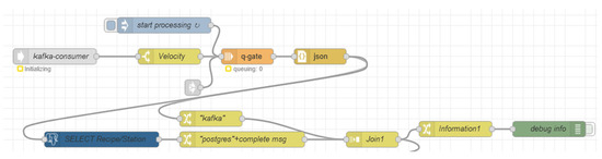 Figure 12. Kafka communication using the “kafka-consumer” node. - Step 2: Filtering messages containing “Velocity”: The second step was to filter the messages coming from the “kafka-consumer”. As mentioned in Section 3.4, the parameter “Velocity_*” was considered the independent variable, and as such, it was used as the input of our API. The switch node “Velocity” (Figure 12) was used to filter the messages that contains the string “Velocity”.