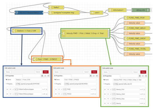 - Step 4: Routing the messages: We started the fourth step by filtering the Stations (i.e., Ford or VW), using the switch node to route the messages based on sequential position. Using the same logic, two new switch nodes were created, one for the Ford station (Ford: 1. PWD; 2. PWCD) and another for the VW station (VW: 1. PWD; 2. PWCD), where it is possible to filter the type of Recipe (PWD or PWCD). Figure 13 illustrates the flow and configuration of the mentioned nodes.