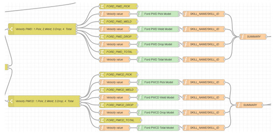 Figure 13. Switch nodes used for routing the messages using the Ford station as example. In the edit switch node, from left to right, we have: Stations: 1. Ford; 2. VW, Ford: 1. PWD; 2. PWCD and Velocity PWD: 1. Pick; 2. Weld; 3. Drop; 4. Total. The same logic was used for the VW station. - Step 5: Deploying the ML predictive models: After creating the route for the messages, it was time to deploy the ML predictive models. Thus, sixteen nodes were created, each one corresponds to a respective task (Pick, Weld/WeldComplex, Drop), of a respective recipe (PWD and PWCD) and of a respective station (Ford and VW). Figure 14 shows the ML predictive models (green nodes) for Ford station. The same logic was used for VW station.