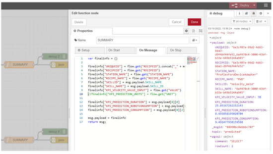 After the ML predictive model nodes, the function node “SUMMARY” was created to track and store all the information that is needed (Figure 15).