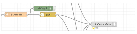 Figure 16. Final flow of the Node-Red API, presenting the node “kafka-producer”, used to send the information back to Apache Kafka.