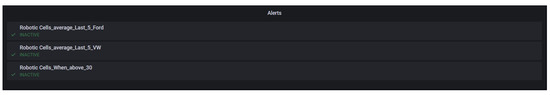 - Alerts: In Figure 18, three alerts were created, with the objective of alerting the user if some basic metrics were out of control. The first two alerts are equal but for different robotic cells, and they measure the last entry and compare it with the average of the last five entries. If the value is superior to 15% of the average value, the alert is raised. The final alert checks if the last entry is bigger than 30 Wh and raises an alert if it is.