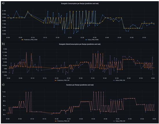 Figure 23. Predicted and real values per recipe of (a) cell energy consumption, (b) robot energy consumption and (c) duration.