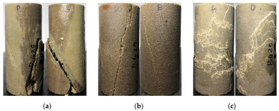 The fracture morphology of the rock is important for determining the brittleness of the reservoir rock. A comparative analysis of the rock fracture modes, which was conducted after the experiment, shows that the fracture forms are divided into three types—single shear fractures, split fractures, and complex fractures—as shown in Figure 1.