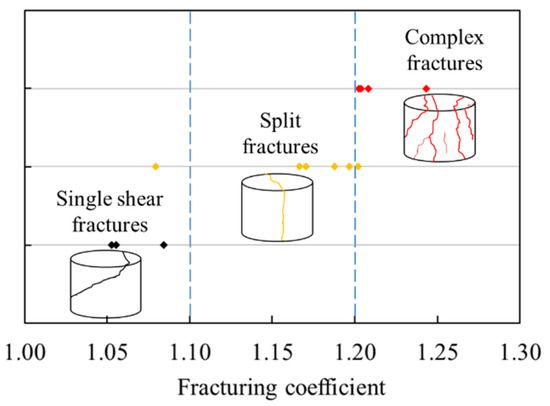 Core fracture morphology under different fracturing coefficients. Black dots represent single shear fractures, yellow dots represent split fractures, and red dots represent complex fractures.