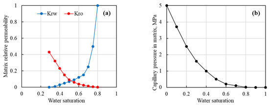 Matrix oil–water phase permeability (a) and capillary pressure curves (b).