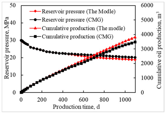 To verify the model’s reliability, the calculation results of this model and CMG software results were compared under the same production and injection conditions. As shown in Figure 7, the errors in the average formation pressure and cumulative production after 3 years of well group production are within 5%, indicating that the model has good reliability.