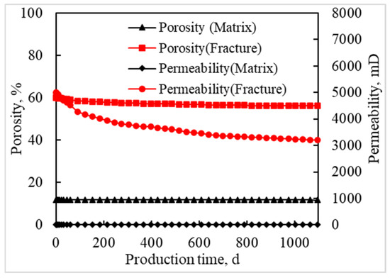 Conventional water injection was performed in well W5 at an injection rate of 30 m3/d. The production well was simulated under the conditions of no fracturing and fractures caused by fracturing, and the effect of fracturing on the production of the well group was analyzed. In Figure 5, point 1 represents the matrix and point 2 represents the fracture. The evolution process of reservoir physical properties in the production process is studied by analyzing the change rules of porosity and permeability at the two points. As shown in Figure 8, the stress sensitivity effect has a great impact on fracture permeability in the production process. The porosity and permeability of the reservoir matrix and fracture porosity have little change.