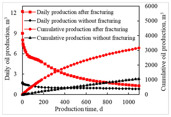 As shown in Figure 9, using well W1 as an example, under the condition of no fracturing, the single-well productivity is low, and the initial daily oil production is only 1.58 m. After fracturing, the initial daily production of a single well increased to 8.02 m, and the multiplication ratio was 5.1. The 3-year cumulative production increased by 2066 m3, which shows good fracturing stimulation potential.