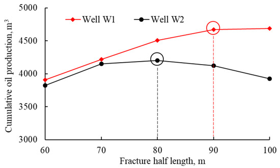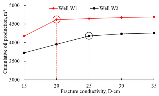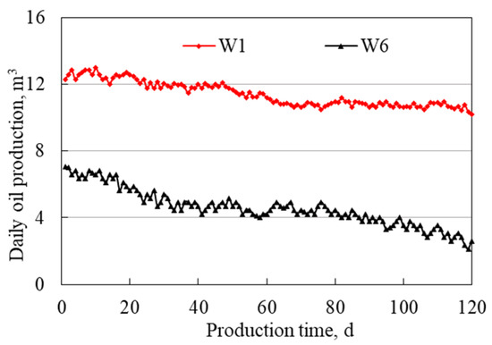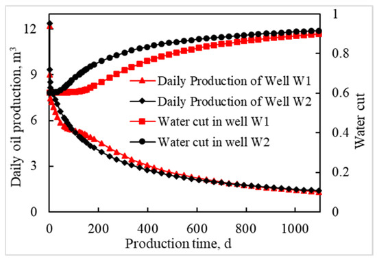 Well W1 was located in the minimum horizontal principal stress direction of the water injection well (W5), and well W2 was located in the maximum horizontal principal stress direction of W5. The fracture orientations of the two wells were inconsistent with the effective direction of water injection, but the other fracture parameters were the same; therefore, the production conditions were compared. As shown in Figure 10, the fracture direction of well W1 was perpendicular to the line connecting the oil injection wells. In the pressure flooding process, the water injection front advanced evenly, the water cut increased more slowly, and the initial production declined more slowly. Water injection lasted longer. The direction of the fracture in well W2 was parallel to the line connecting the oil injection well. During the water injection process, the water flooding front protruded more considerably along the dominant fracture channel, resulting in a faster rise in the water cut and rapid decline in the production of the well. Therefore, the effect of fracture orientation on the production effect of production wells should be fully considered in the process of reservoir development and well deployment.