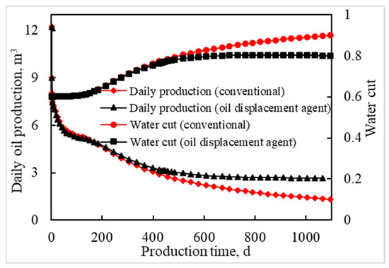 Taking well W1 as an example, the production process of conventional water injection and the effect of the oil displacement agent addition were simulated. The mass concentration of the oil displacement agent was 0.5%, and the influence of the oil displacement agent on the production effect during the water injection process was analyzed. As shown in Figure 11, the production trend in the early stages of the two cases is the same; the single-well production decreases and the water cut increases. After 400 d of production, the oil-displacing agent reached the vicinity of the production well, the oil–water mobility ratio increased, and the water-cut rise rate slowed down. The daily oil production was stable at approximately 3 m3, and the cumulative oil increase was 643.7 m3 in 3 years.