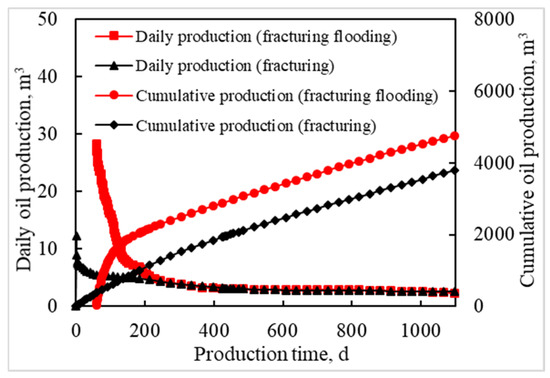 According to the fracturing flooding technology of low-permeability sandstone reservoirs in the Shengli oilfield, water was rapidly injected into the formation of well W5 at an injection rate of 0.5 m3/min (the mass concentration of the oil displacement agent was 0.5%) to supplement the formation energy. After 2 months, a total of 43,200 m3 was injected. Conventional water injection with an injection rate of 30 m3/d was subsequently used, and the production well was opened for production. A comparison between the fracturing flooding process and conventional fracturing production is shown in Figure 12. The daily oil production of conventional fracturing was 8.02 m3, and the cumulative oil production after 3 years was 3793 m3. After the completion of fracturing flooding, the formation energy was sufficient, and the initial daily oil production was 27.3 m3. However, the production decreased rapidly in the early stages. After 180 d of fracturing flooding, the production dropped to the same level as that of conventional fracturing (4.2 m3). In other words, the period of fracturing flooding was valid for 6 months, and after 3 years, the cumulative oil increase was 970 m3, and the effect of fracturing flooding was obvious.
