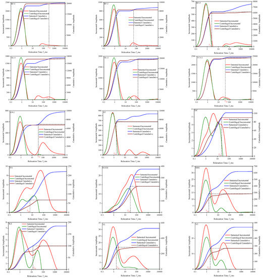 LF-NMR experiments were conducted on the Rec Core2500 low-field nuclear magnetic resonance measuring instrument in the China petroleum exploration and development research institute Langfang branch. The sample size was Φ2.5 cm × 5 cm, and samples were cut in the laboratory. The LF-NMR experiment was divided into two parts: (1) Using 100% saline saturated + LF-NMR: Before the experiment, the samples were placed in a drying oven at 70 °C for 24 h to constant weight, then vacuumized for 8 h, and finally placed in saline for 24 h under vacuum pressure to saturate the samples, and then LF-NMR was conducted on the 100% saturated samples. (2) High-speed centrifugation + LF-NMR: The samples were removed and placed in a centrifuge for 1 h at high speed of 10,000 r/min, and LF-NMR was conducted on the centrifuged samples. By using two series of LF-NMR with 100% saturated saline and 10,000 r/min high-speed centrifugation, each sample can obtain two T2 spectra in 100% saturated water and residual water for the calculation of the T2 cutoff value.
