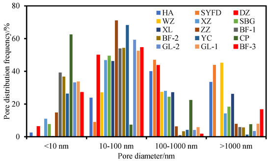The LTN2A experiment instrument is a TriStar II 3020 specific surface and porosity analyzer. After drying and degassing, the nitrogen adsorption capacity of 2 g 40–60 mesh powder samples was determined at 77 K under different relative pressures (0.001~0.998) based on the multipoint Brunauer–Emmett–Teller (BET) and Barrett–Joyner–Halenda (BJH) models. The nitrogen adsorption branch data were interpreted to obtain the specific surface area, pore volume and pore size distribution parameters.