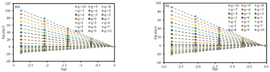 Log–log plots of the partition function versus box scale. ((a) HA sample (b) XL sample).