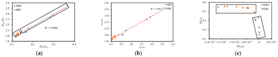 The multifractal parameters show a strong correlation, and the correlation coefficient is above 0.9 (Table 3). Second, the multifractal singular spectrum is another basic language used to describe the multifractal characteristics of the pore structure of porous media. There is a strong correlation between the parameters of the Dq-q spectrum and the f(α)-α spectrum. The f(α)-α spectrum is an equivalent mathematical description to the Dq-q spectrum, which can equally quantify the heterogeneity of the pore structure in different density regions of porous media. Both can be used to describe the multifractal behavior of pore structures [23].