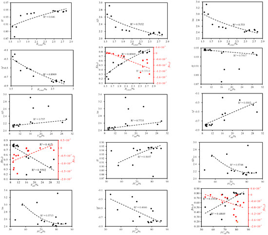 With the increase in Ro,max, the value of f(α10) of medium-high rank coal gradually increases, and the value of f(α-10) gradually decreases. That is, in the process of coalification, the proportion of homogenous regions of medium-high rank coal increases and gradually dominates, while the proportion of heterogeneous regions decreases, and the pore structure of medium-high rank coal reservoirs tends to be homogenized. Therefore, it can be observed that with the increase in Ro,max, ΔD and Δα of medium-high rank coal show a decreasing trend. Generally, pore connectivity is closely related to the heterogeneity of pore structure, and a complex pore structure can effectively reduce pore connectivity. Therefore, with the increase in Ro,max, the H value of medium-high rank coal increases, and the pore connectivity of the coal seam gradually improves. Vdaf and FCad are closely related to coalification. The larger FCad is, the lower Vdaf is, and the greater the degree of coalification is. Therefore, it can be observed that the relationship between FCad and H, ΔD, Δα, Δf, f(α-10) and f(α10) is basically the same as Ro,max, while Vdaf is the opposite; that is, the higher the degree of coalification is, the more homogeneous the pore structure of the medium-high rank coal reservoir. Second, the correlation between Vdaf and FCad and multifractal parameters is relatively low compared with Ro,max. This is because Vdaf is similar to Ro,max, but it reflects the overall properties of coal samples, including various macerals, and its resolution to the degree of coalification is inferior to Ro,max (Figure 9).