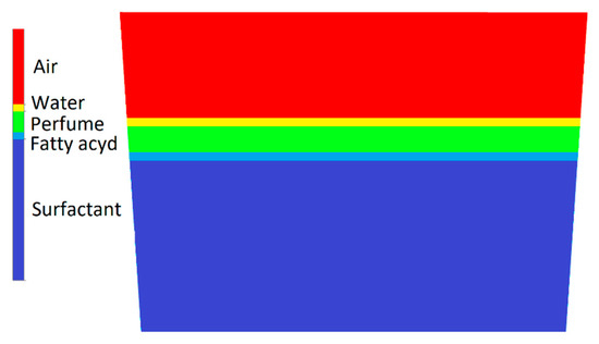 Image of a vertical section by canister axis of the canister initial compounds filling condition. Surfactant in red; fatty acid in yellow; perfume in green; water in light blue; and the air above the liquid’s surface in dark blue.
