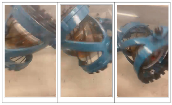 Photographs of the mixing device at SINTEF LAB at three different instants of the liquid detergent mixing. High rotating speed makes them appear as “moved” NOTE: the FABLAB is under patent pending, so the scientific publication cannot provide specific details about actual performance.