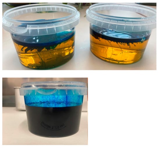 These photographs can be seen in Figure 5. In this figure, we can observe, in the top picture, the situation before mixing where the surfactant, denser and first added, fills at canister bottom and the dye solution diluted in water, lighter, the top. In the lower picture, the mixed mixture after 7 s. As can be observed, 7 s are appropriate to obtain a good mixture. The experiment corresponding to the validation case was carried out twice to verify reproducibility; the same results were obtained. The photographs of the transparent wall canister at different mixing times of both tests were visually indistinguishable. As each compound has a different color, homogeneity could be visually observed