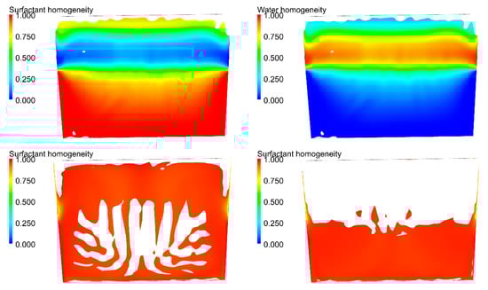 Images of the surfactant homogeneity value after 0.25 s of mixing (up, left), the water homogeneity value after 0.25 s of mixing (up, right), the surfactant homogeneity value after 3.75 s of mixing (below, left) and the surfactant homogeneity value after 7.50 s of mixing.
