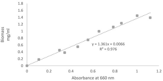 Calibration curve between algae biomass and absorbance at 660 nm.