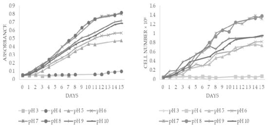 Influence of different initial pH values between 3 and 10 on growth of D. salina at light intensity of 3000 LUX and 50 g/L NaCl. The cultivation conditions were constant at 27 °C. (left) Absorbance at 660 nm and (right) cell number per mL.