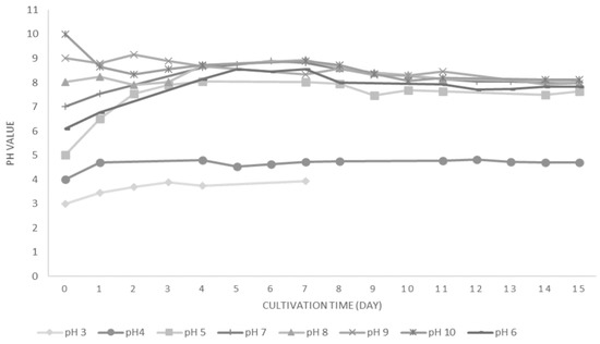 The results showed that a pH of 6 leads to a better biomass in comparison to pH of 5, whereas no growth was appreciable when the cultivation of D. salina was at a pH of 4. The cells died after 7 days if the initial pH of the medium was 3. The initial pH especially affects the lag phase. For instance, at a pH of 9, no lag phase is recognizable, but at a pH value of 4, the algae remained in the lag phase. The lag phase lasts 1 day at a pH of 6, 7, 8 and 10. Nevertheless, lag phase of 2 days was observed when the D. salina was cultivated at a pH value of 5 or 2. These results can be shown in Figure 3.