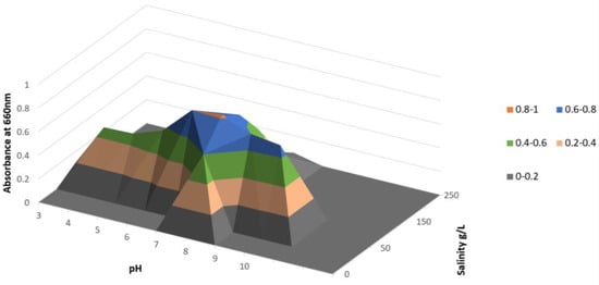 The optimization of the salt content and the initial pH level led to an optimum near the expected range found in the single observation of these parameters. As shown in Figure 5, the vertexes pH 6.5/salinity 62.5 g/L and pH 7.875/salinity 65.625 g/L led to the best result. The final absorbance at these two points was 0.901 and 0.885. All other points resulted in lower finals absorbances. The results of the tests in Figure 3 and Figure 4 are confirmed; these results suggest an optimum pH value between 7 and 8 and an optimum salt content between 50 g/L and 100 g/L.