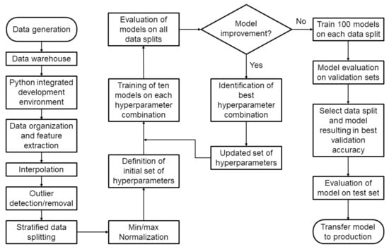 All ANN models were generated using Google’s Tensorflow 2.5.0. (Google, Mountain View, CA, USA) Python library [58]. The model hyperparameters were optimized using a Python script that compared the accuracies of models trained with multiple hyperparameter combinations. This process is represented by the loop in Figure 1, and a more detailed description of the algorithm can be found in Appendix A. An overview of the final hyperparameters is presented in Table 1. For model selection, 100 models were trained using the optimized set of hyperparameters. The model that resulted in the smallest MSE for the validation set and the smallest sum of the MSEs for the training and validation sets was picked for further analysis.