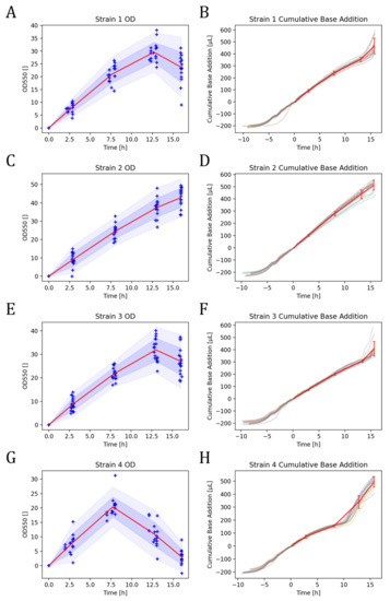 Visualization of the aligned time-series data of the OD and cumulative base addition of the center point experiments of strain 1 (A,B), strain 2 (C,D), strain 3 (E,F) and strain 4 (G,H), respectively. For plots (A,C,E,G), the area in dark blue indicates the standard deviation and the light blue area the tolerance interval. The mean for all plots is indicated as a red line. Individual measurements are marked by blue plus signs.