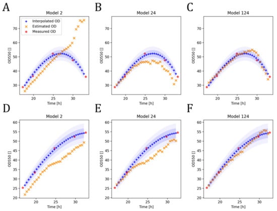 In the first example shown in Figure 3A–C, model 2 incorrectly estimated an OD increase throughout the process. This was most likely due to the rare increases in OD in the training set of model 2. In contrast, model 24 identified the OD decrease and model 124 replicated the OD accurately. Similarly, in the second example illustrated in Figure 3D–F, model 2 underestimated the OD throughout the process, whilst the expansion of the training set for model 24 as well as model 124 refined the model estimations further.