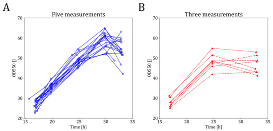 Comparison of OD trends of fermentations with identical process conditions with five OD measurements (A) and fermentations with three OD measurements (B) of strain 2.