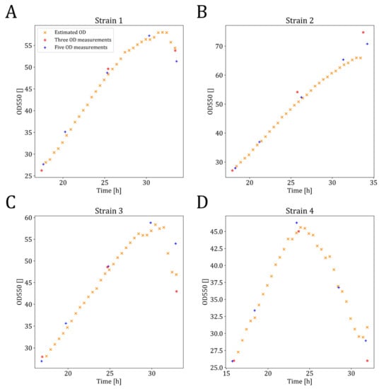 Upon initial examination, the estimation performance may appear worse when compared to the estimation performance for fermentations with five OD measurements. However, the performance evaluation was assessed using OD values derived from spline interpolation. As fewer OD measurements were taken, the spline interpolations have most likely underfitted the true OD, since peaks that occurred between measurements, were not captured correctly. This behavior was most pronounced for strain 3, where a peak that typically occurred at 30 h was missed when applying the measurement regime with only three measurements, which can clearly be seen in Figure 4.