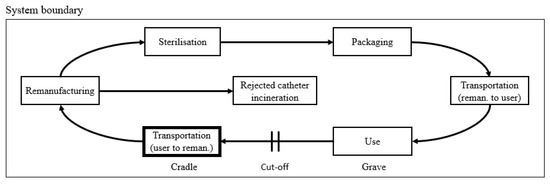For a meaningful comparison between one virgin and one remanufactured catheter’s life, we choose the cut-off system model. Consequently, emissions from waste treatment after the first life are attributed to the producer [23]. In other words, the used virgin catheters are burden-free for the remanufacturing process.