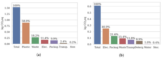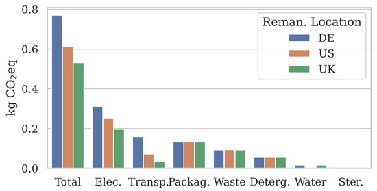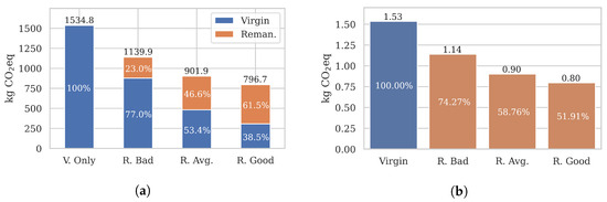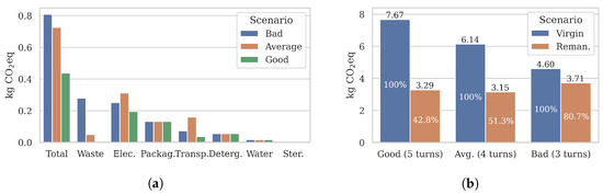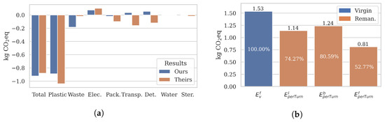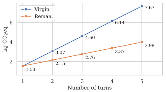 In contrast, results marked with the superscript b include the emissions from previous lives, i.e., the emissions are burdened. These values are dependent on the number of turns N, which describes the total number of uses before a catheter reaches the end of its life and is discarded. For example, a catheter with turns is used exactly three times: once as a virgin catheter and twice as a remanufactured catheter. The formula for a catheter’s emissions across its whole life is given in Equation (3).
