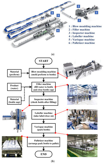Packaging beverages in plastic bottles is an extremely popular strategy to cater to the market due to its convenience of production and low production cost. Several types and working principles of machines are employed in the production system for plastic bottled beverages. In this study, the production system of plastic bottled beverages starts from the bottle production process to filling and delivery processes, as depicted in Figure 1a.