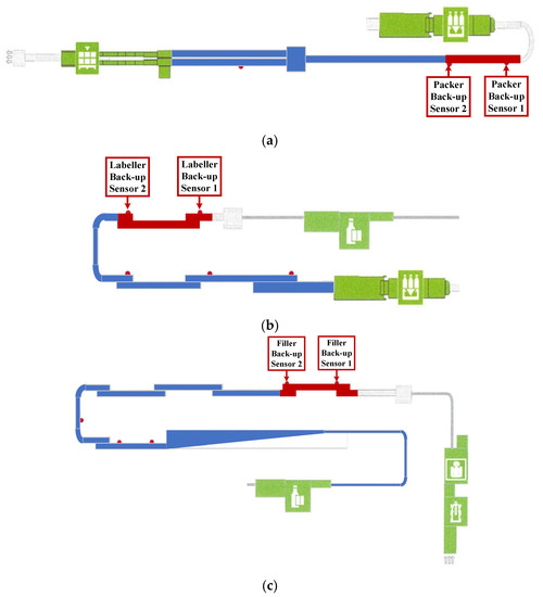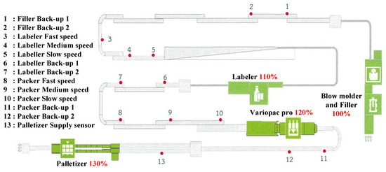 The waiting time for draining the bottles from the conveyor assumes different values for each machine, as listed in Table 3. When one of the machines is stopped, this stoppage affects other machines in the previous process. For example, if the palletizer machine is stopped, the bottles fed from the variopac machine will accumulate in the conveyor between the palletizer machine up to the variopac machine’s backup sensor 1. This results in the stoppage of the variopac, labeller, and filler machines, respectively, as illustrated in Figure 8.