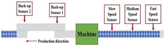 A schematic diagram of the machine speed and sensor position of the production system is illustrated in Figure 2. Each machine has a production speed that differ by 10% from each other in order of their position in the production line. The blow moulding and filler machines have the lowest production speed because they are the primary machines in this line. Other machines require higher production speeds to move the bottle in the conveyor to ensure no overflows and continual production. The operation of each machine is controlled by sensors that detect the number of bottles in the conveyor; the working principle of these sensors are presented in the following section.